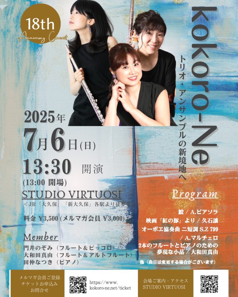 18周年を記念した2本のフルートとピアノのトリオ【kokoro-Ne】の周年コンサート。今回も大和田 真由の作編曲したレパートリーをご用意しております。こだわり抜いた音選び、大和田の世界観をお楽しみください。楽譜の直売会もやりますので、どんな楽譜なのかもお手に取ってご覧いただけます。直売会限定のスペシャル価格でご案内する予定です!